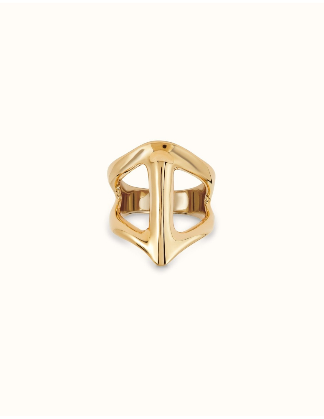 El anillo UNOde50 bañado en oro de 18 k con forma de mantarraya (ANI0846), TALLA 15, es una pieza artesanal emblemática de la colección Ser Majestuosa, fabricada 100 % a mano en España con acabado en oro de alta calidad que le da un brillo dorado sofisticado; su diseño escultórico con líneas marcadas y vacíos estratégicos crea un efecto visual impactante y envuelve el dedo con personalidad y elegancia, convirtiéndose en un complemento versátil que realza desde estilos diarios hasta conjuntos más formales y femenino.