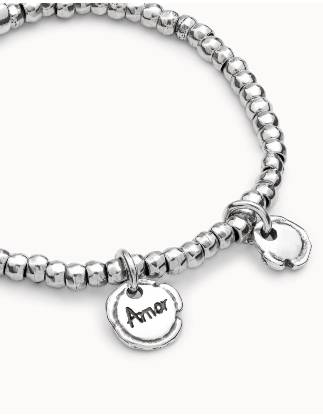 Pulsera UNOde50 Amor Sellado PUL1596MTL0000M, una joya artesanal única bañada en plata con charms exclusivos que evocan cariño y estilo. Su diseño elástico con cuentas y charms –incluyendo uno grabado con la palabra Amor y otro con forma de corazón– la convierte en el regalo perfecto para expresar afecto o complementar tu look diario con un toque elegante y significativo. Fabricada 100% a mano en España, esta pulsera une moda y sentimiento en una pieza imprescindible.