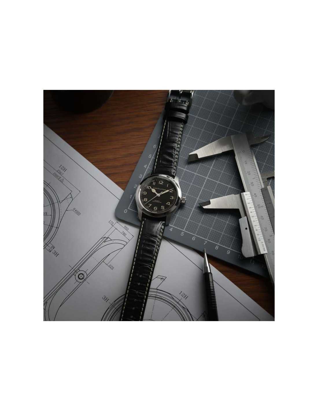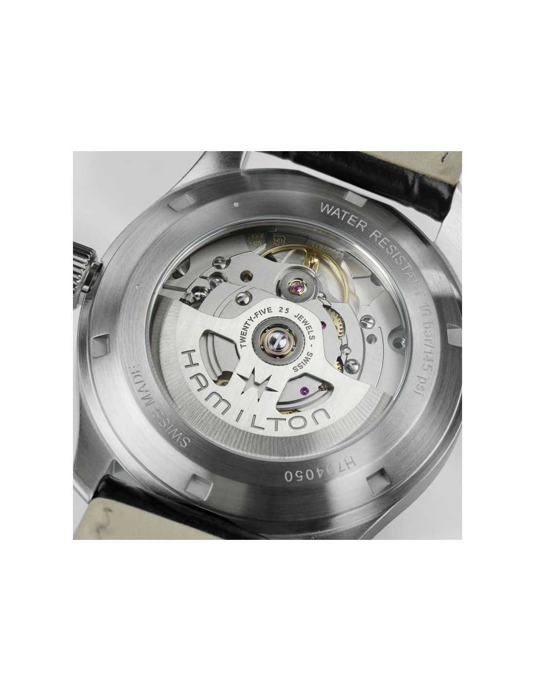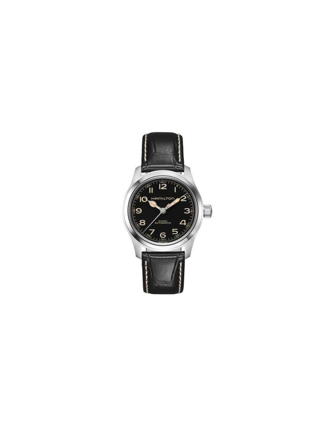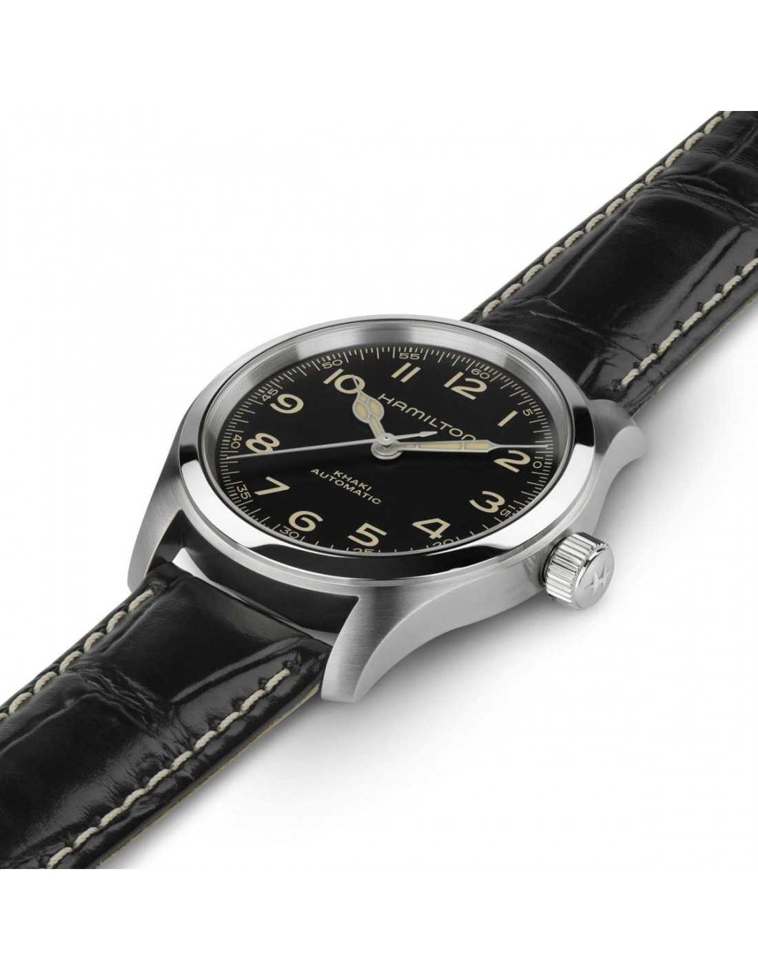 El Hamilton Khaki Field Murph 38mm H70405730 es un reloj automático con caja de acero inoxidable de 38 mm, esfera negra y correa de piel negra, que ofrece una reserva de marcha de 80 horas.