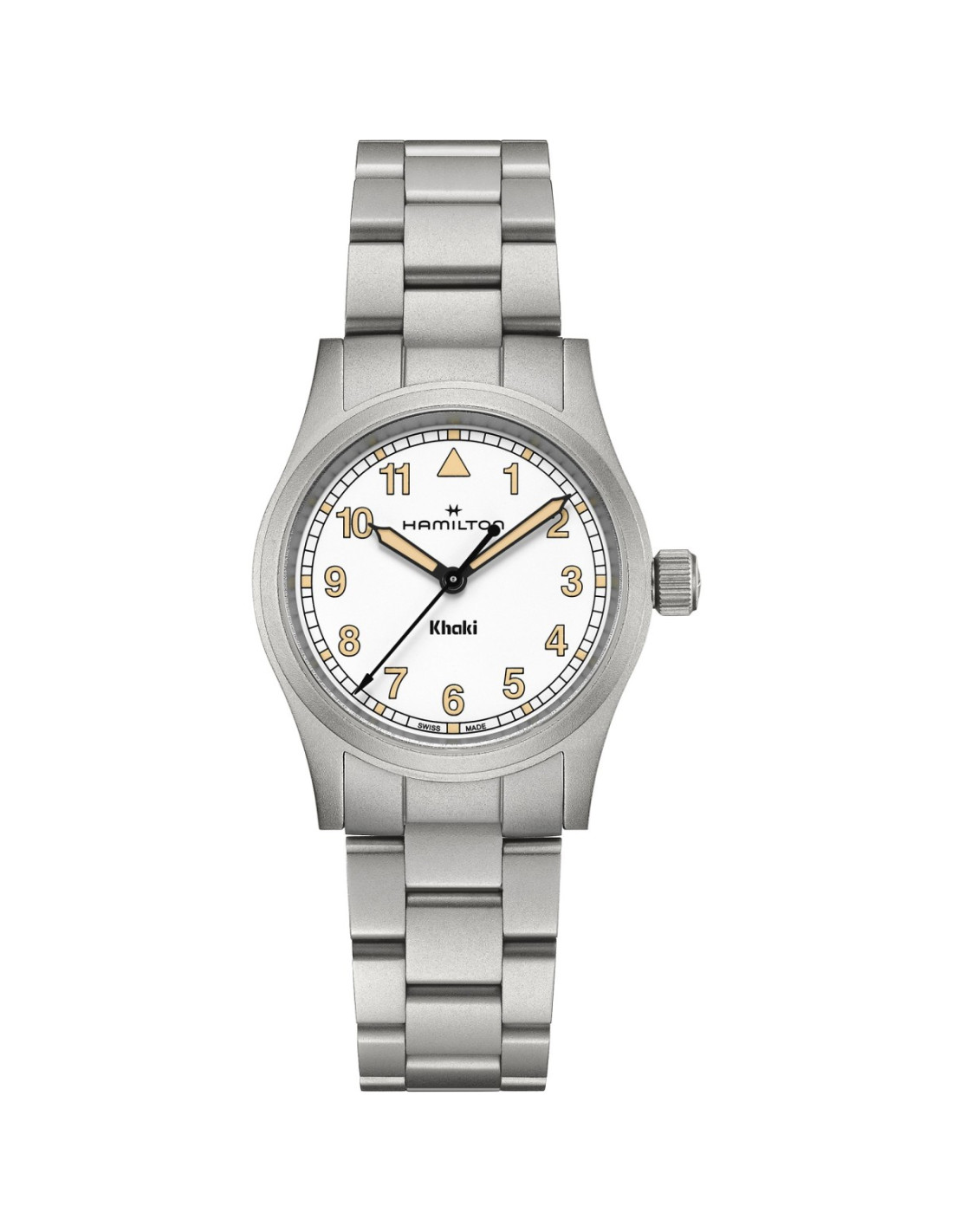 El Hamilton Khaki Field Quartz 33 mm H69301110 es un reloj suizo de estilo militar con movimiento de cuarzo ETA F05.105, esfera blanca y diseño robusto. Con caja de acero inoxidable de 33 mm y cristal de zafiro, ofrece precisión fiable y gran legibilidad diarios.