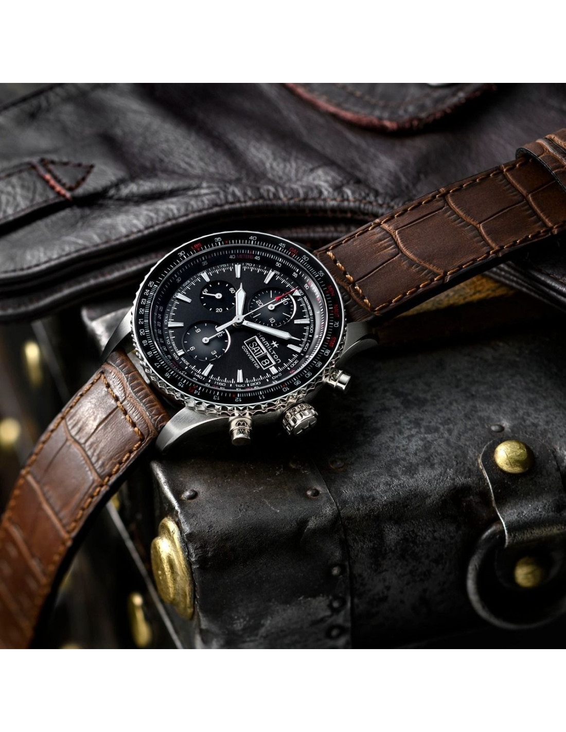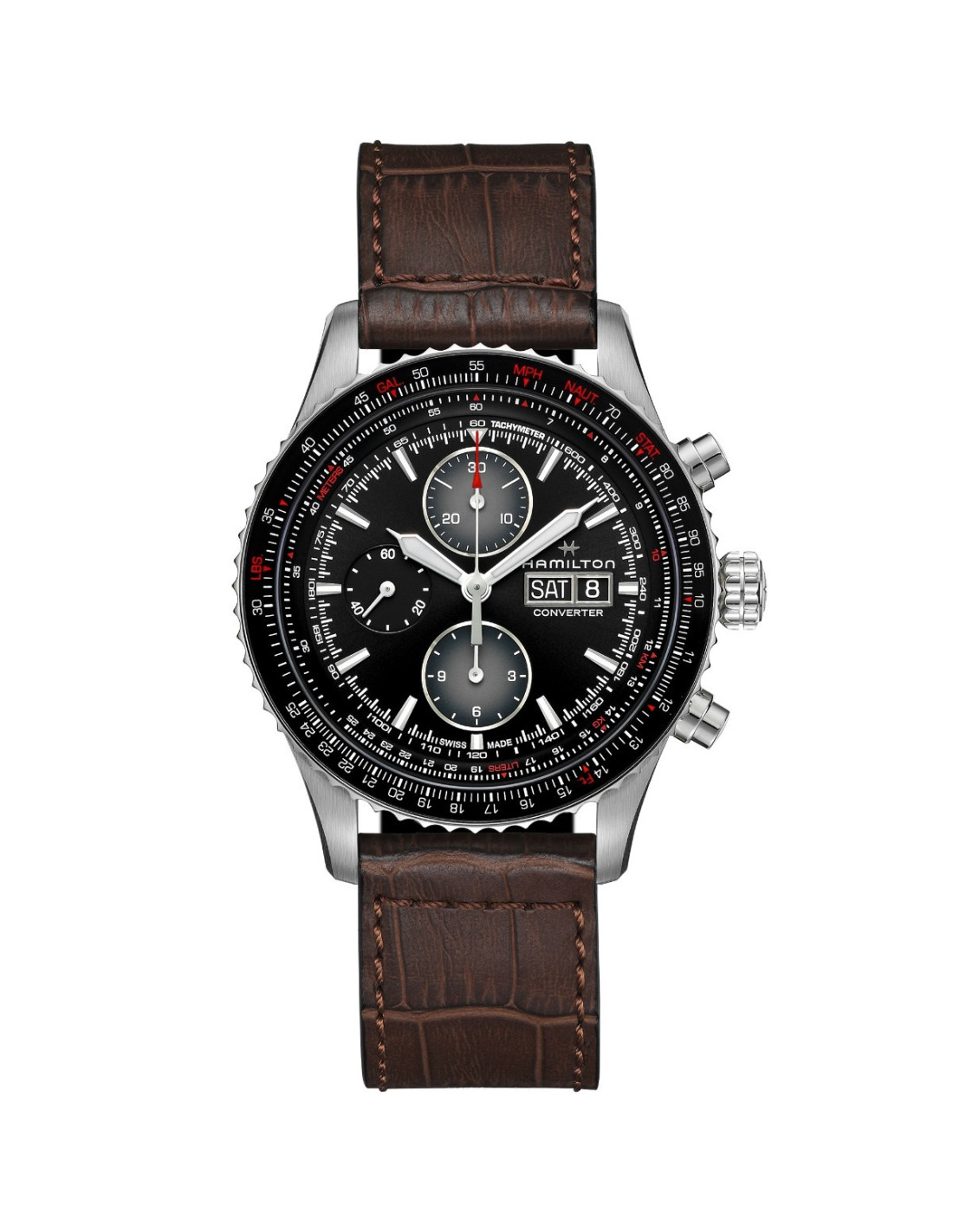 El Hamilton Khaki Aviation Converter Auto Chrono H76726530 es un reloj suizo de aviación diseñado para ofrecer precisión técnica y versatilidad. Equipado con un movimiento automático cronógrafo H-21-Si con espiral de silicio antimagnético y reserva de marcha de 60 horas, permite medir tiempos y realizar conversiones de unidades mediante su regla de cálculo en el bisel. La caja de acero inoxidable de 44 mm alberga una esfera negra con subesferas y funciones de día, fecha y taquímetro, protegida por cristal de zafiro resistente a arañazos. La correa de piel marrón con cierre de hebilla completa un diseño pensado para la vida activa del piloto moderno.