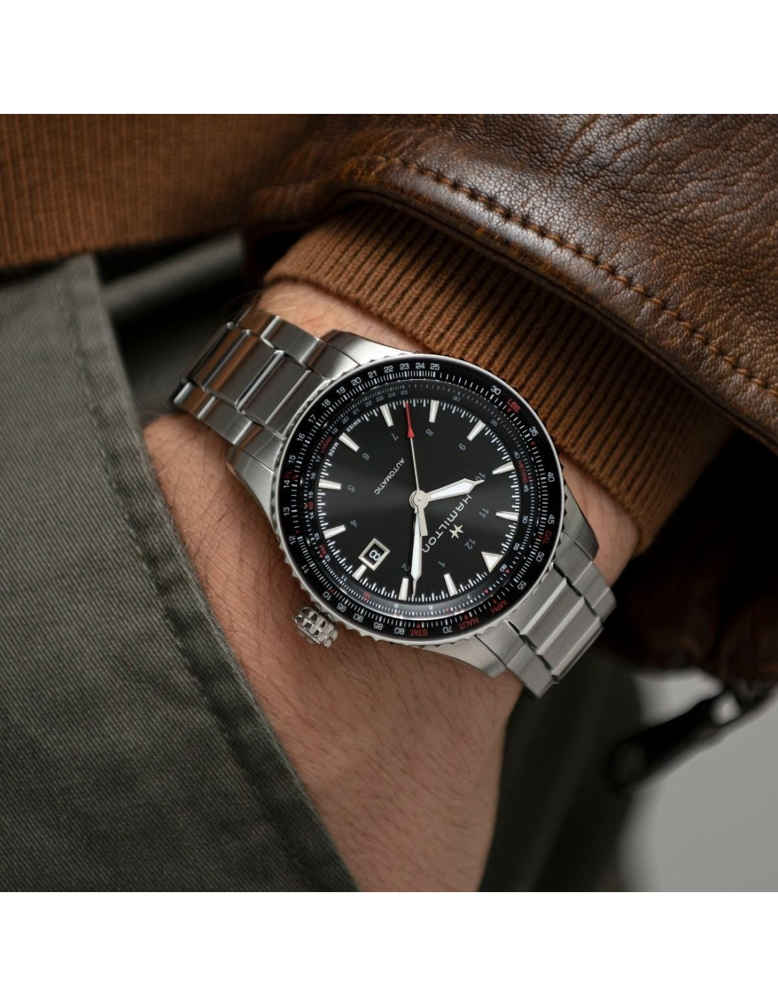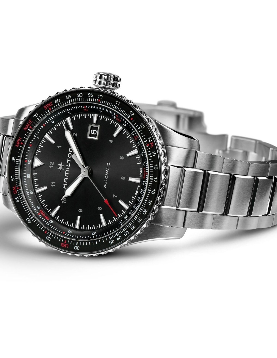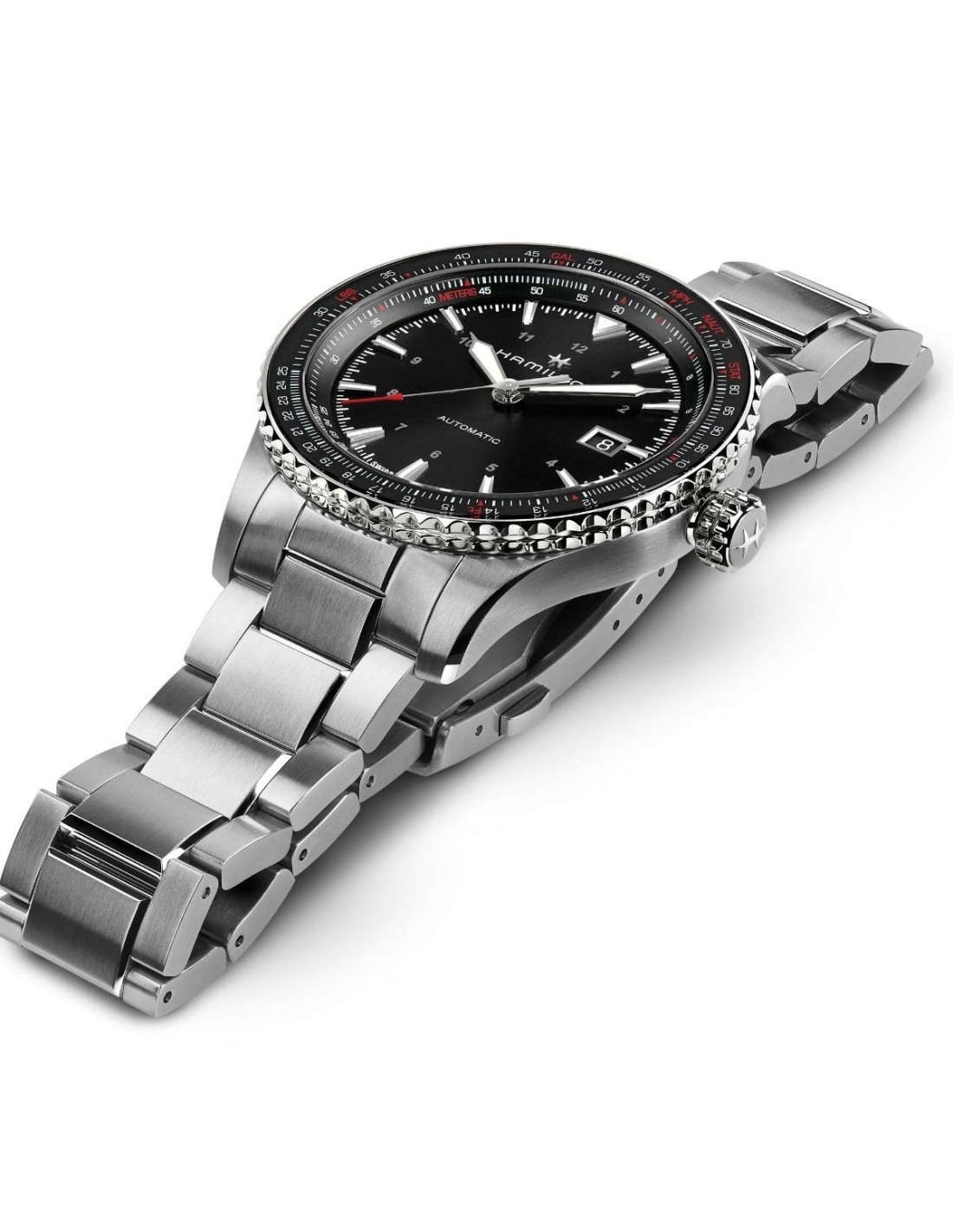 El Hamilton Khaki Aviation Converter Automatico H76615130 es un reloj piloto funcional con diseño técnico y construcción robusta. Cuenta con una caja de acero inoxidable de 42 mm y una esfera negra clara con indicadores luminosos para una lectura rápida. El bisel giratorio bidireccional permite realizar cálculos de navegación y conversiones útiles, mientras que el movimiento automático calibre H-10 proporciona hasta 80 horas de reserva de marcha. El brazalete de acero con cierre desplegable completa la estética profesional.