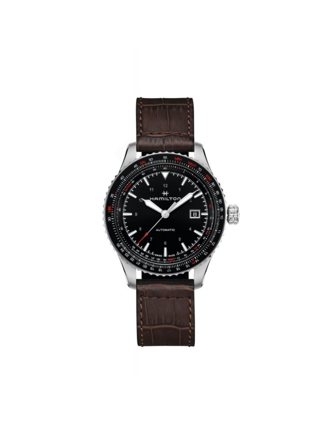 El Hamilton Khaki Aviation Converter Auto H76615530 es un reloj automático de pilotaje con estilo técnico clásico, equipado con movimiento H-10 con 80 h de reserva de marcha, caja de acero de 42 mm, bisel con regla de cálculo y correa de piel marrón. Perfecto para aviadores y entusiastas de relojes instrumentales.